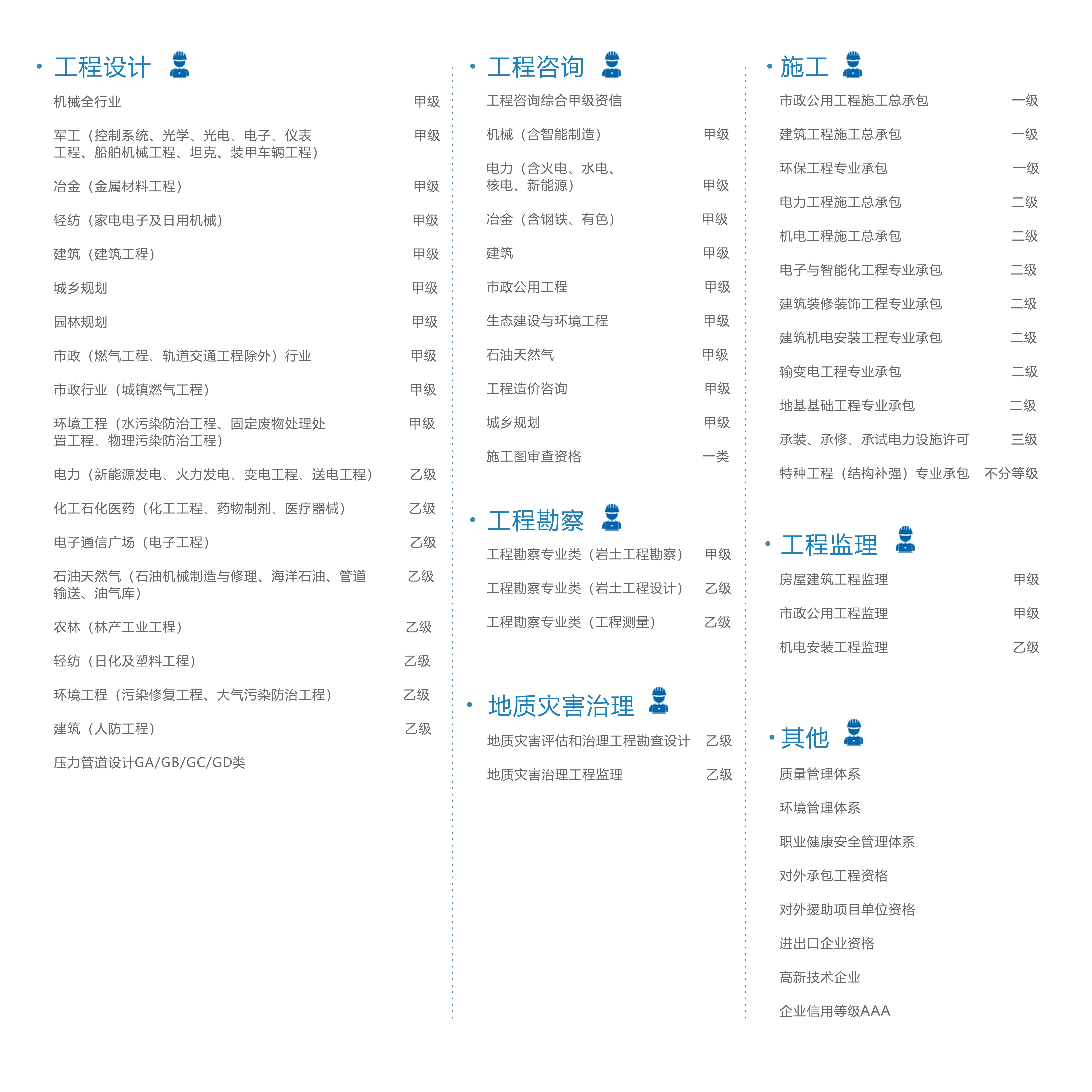 中機國際集結8大行業32個專業類別的甲級設計資質,并具有進出口企業資格和對外承包工程經營資格。全面、專業的資質水平,為公司快速拓展海內外“兩個市場”奠定了可信可靠的基礎。